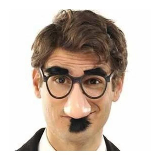 Make the crowd laugh with this funny set of glasses. Hinged plastic frames with caterpillar faux hair eyebrows, over sized plastic nose and a toothbrush moustache. One size fits most.