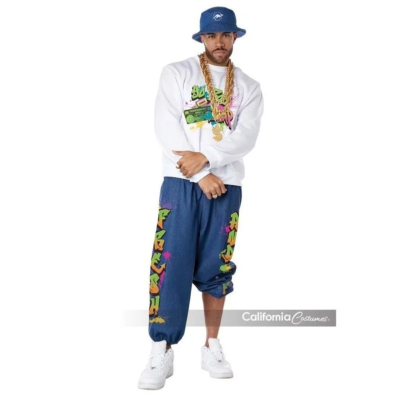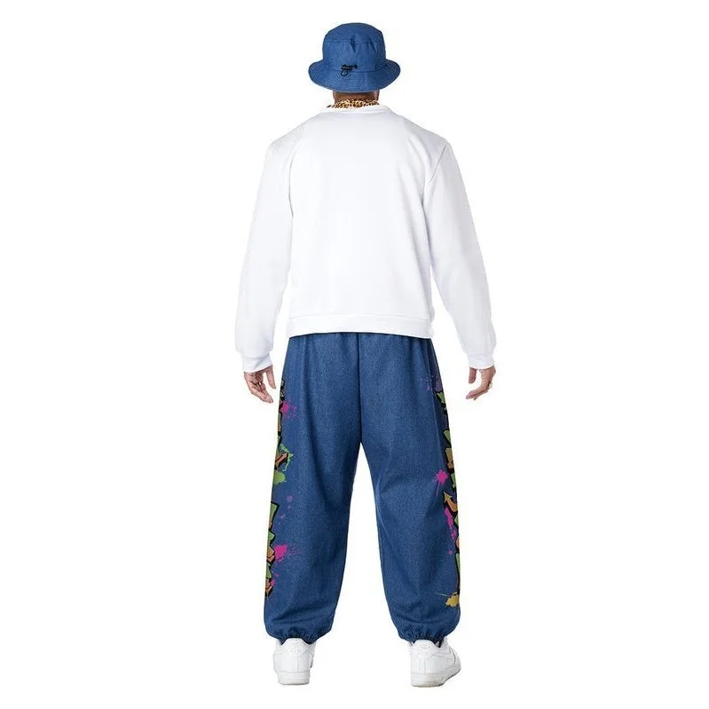 Be old enough to, or pretend to relive this vibrant 90’s street wear style. The 90’s Hip Hop costume comes with top with print “Old Skool”, pants with print “Fresh and Fly” and hat.