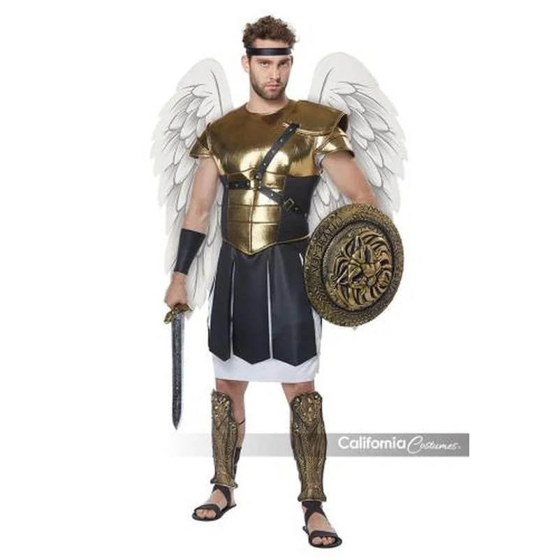 Product Description: To serve the path to the light. The Archangel costume is made up of a shirt piece with front half gold foam armor and details, a white under tunic, a pair of wings with elastic shoulder straps, a headband, a pair of wrist cuffs and a pair of shin guards.