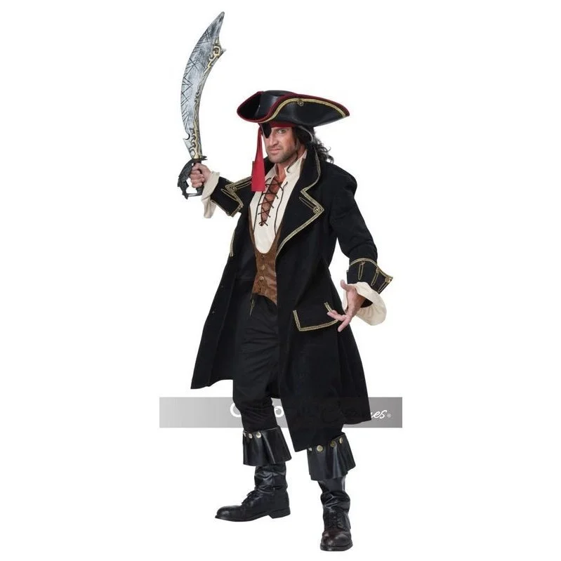 Product Description: Lead your pirate crew with bravery and style. The men Deluxe Pirate Captain is a long jacket with an attached vest and decorative faux shirt sleeve ends. It comes with a dickey with black laces, a pair of boot covers, a red head tie and a tricorn hat. Pants, shoes, eye-patch are not included. Pirate Cutlass sold separately.