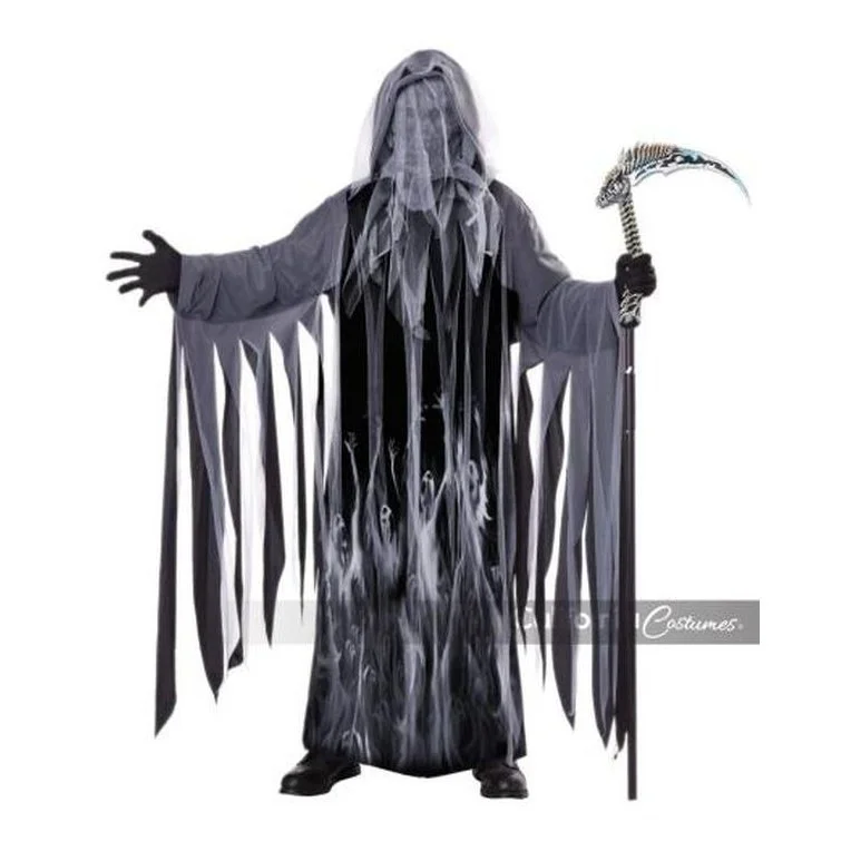 Product Description: Your soul to take. The Soul Taker reaper costume comes with a robe with attached hood and spirit mask with attached organza overlay. Gloves, shoes and staff not included.