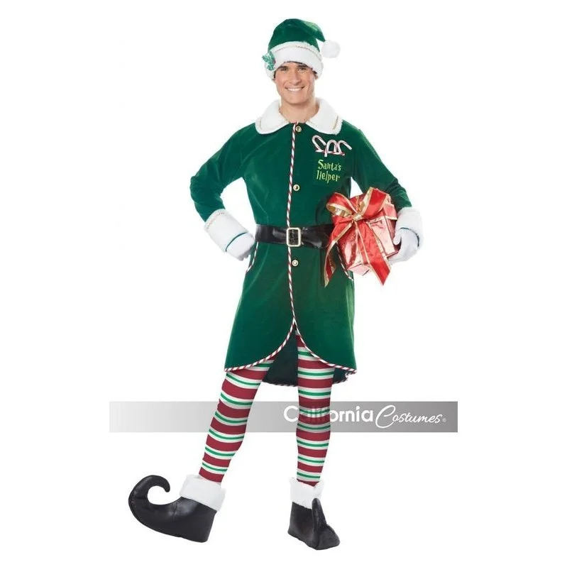 Product Description: Working hard to bring Christmas joy. The Workshop Elf includes a long button down coat with a faux fur collar and cuff trim, a pair of stripped tights, an elf hat, a belt, and a pair of shoe covers. Gloves, gift box, and candy canes not included.