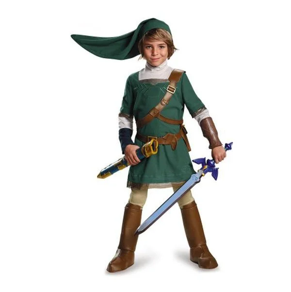 Tunic top, chest belt, pants, belt with attached pouches, hat, wrist guard and pair of bootcovers. (toy sword and shield not included)