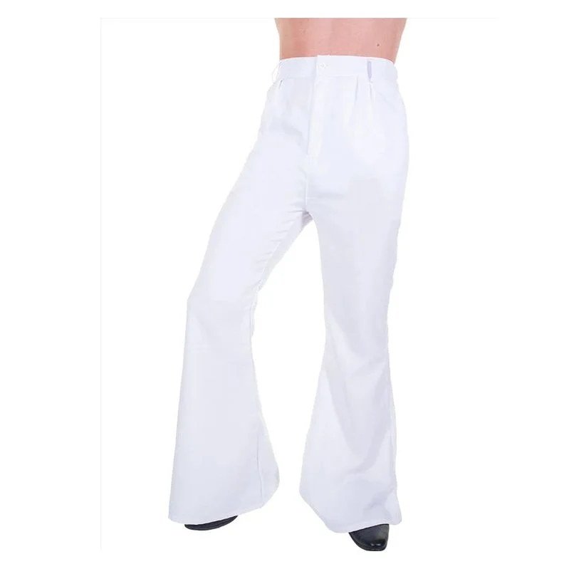 Hit the disco floor in style with these White Flare Mens Pants. The pants are white with flared bottoms and belt loops around the waist. Grab some platform shoes and you’re ready to boogie!