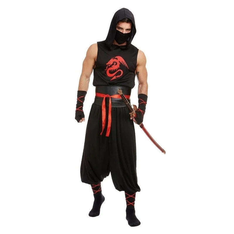 Prepare for battle in this Masked Ninja Mens Costume. The costume includes a black hooded singlet with red dragon screen print as well as a pair of flowing black pants. Also included is a black faux leather Obi belt with red tie detail, a black face mask and a pair of black fingerless gloves with red lace up detail.