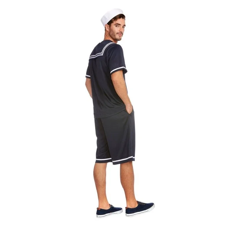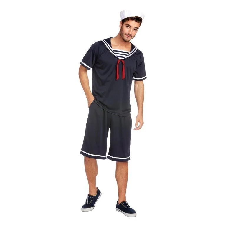 he high seas are calling your name. This seaman is ready to report for duty. Adventure awaits. Who doesn’t love a man in uniform. This three piece costume features an ultra-comfortable dark blue shirt with sailor collar and striped detailing. Also includes dark blue matching shorts and a white sailor hat
