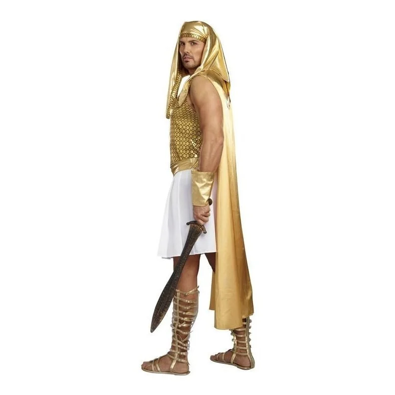 You’ll look like an Egyptian God wearing our Ramses Mens Costume. The Ramses costume features a gold glitter top, and a white Egyptian-styled skirt with an attached gold waistband. The costume also features a gold collar with a cape, headpiece and 2 matching wrist gauntlets. Also, try wearing the costume without the shirt, you’ll certainly be the centre of attention at your next event.