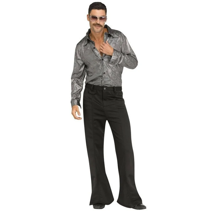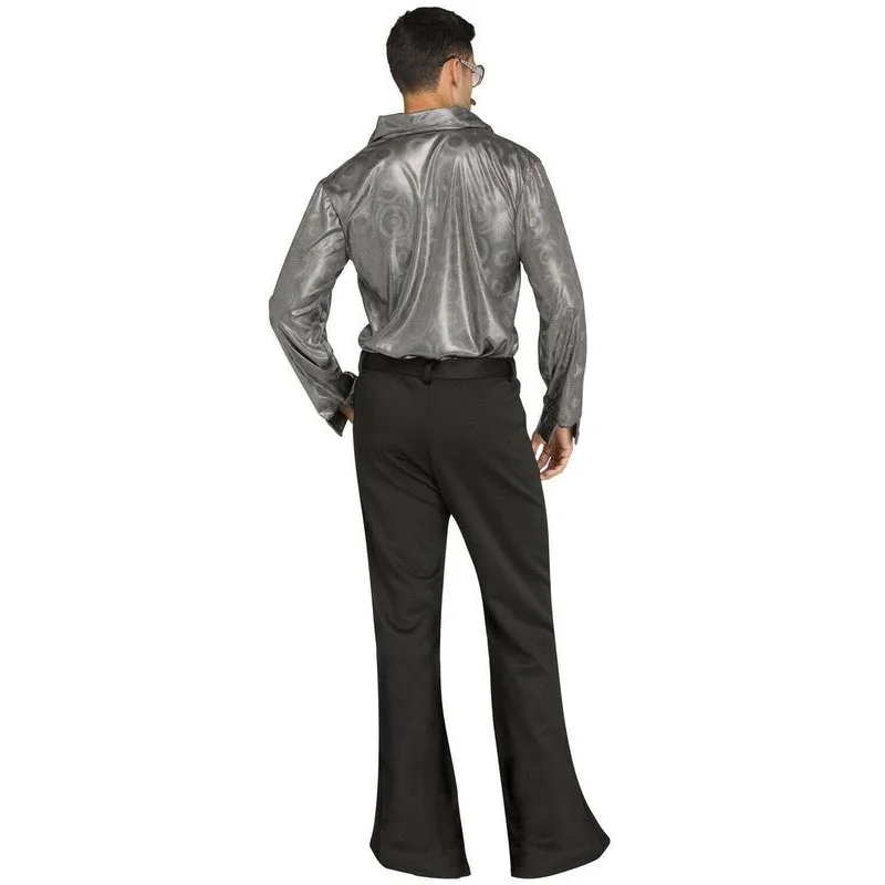 This item features a pair of black pants with slight flare at hem. It also includes shiny silver buttoned down shirt with large collar. You can experience all your disco fever dreams when you’re wearing the Mens Disco King Costume!Â