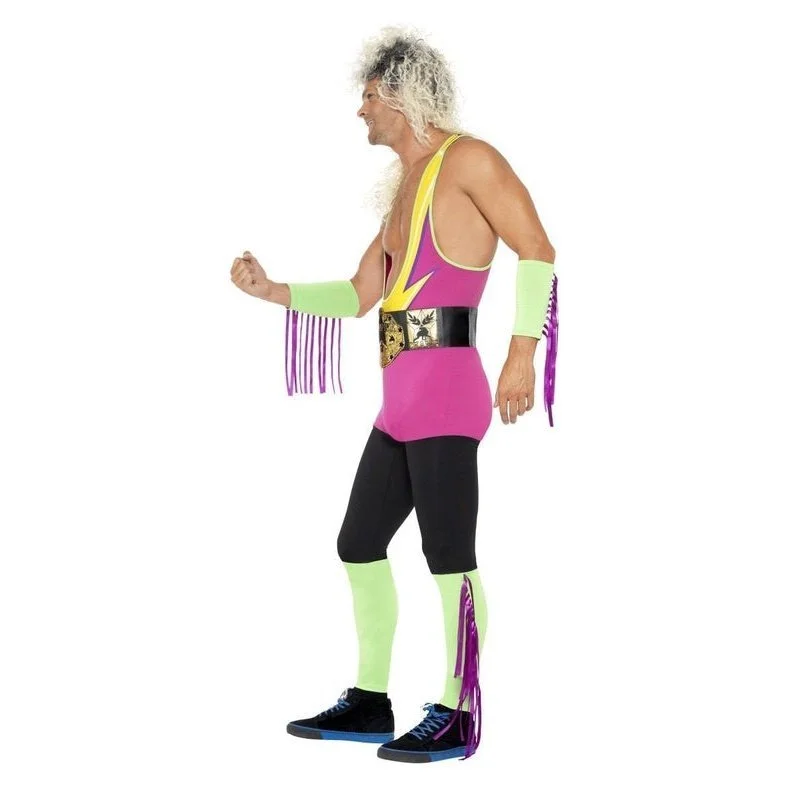 Retro Wrestler Costume, with Bodysuit, Belt, Arm and Leg Cuffs