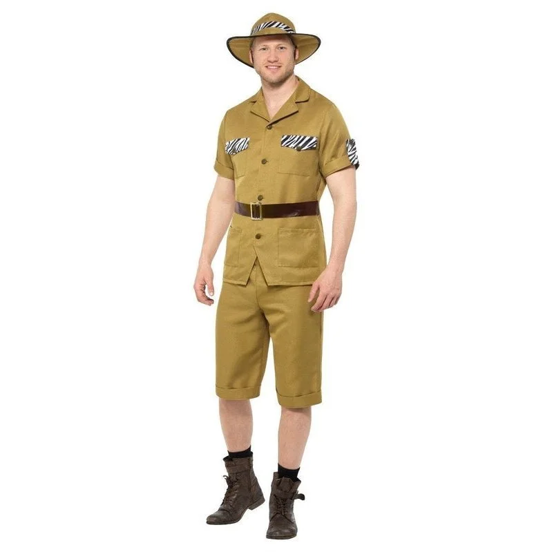- To complete the look, this men’s costume comes with a wide brim safari hat with black piping along the wired edge and zebra print at the front of the hat band.