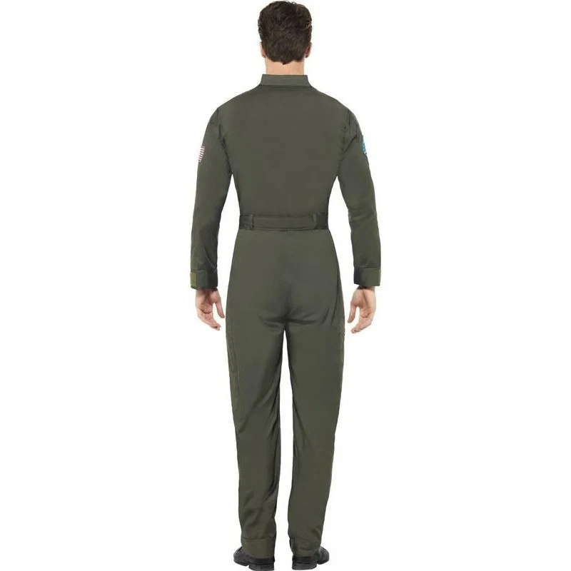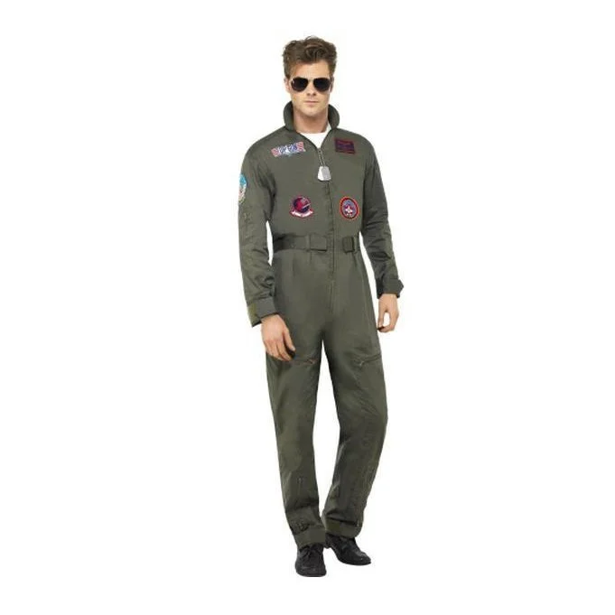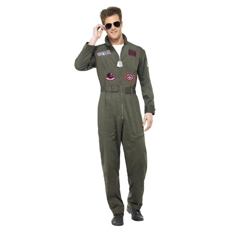 A dark green khaki jumpsuit with attached pilot badges on the chest and arms, and an attached belt for an authentic look. The jumpsuit secures with a long zip fastening at the front, perfect for a quick transformation into this classic pilot. Completing this iconic film inspired look is a pair of silver dog tags and a pair of dark tinted sunglasses,