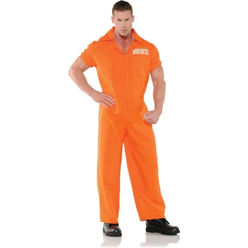 Possibly the most authentic prison jumpsuit we carry! Zip-front orange prison jumpsuit with screen print numbers on front and “Dept. of Corrections” screen print on back. Shoes not included.